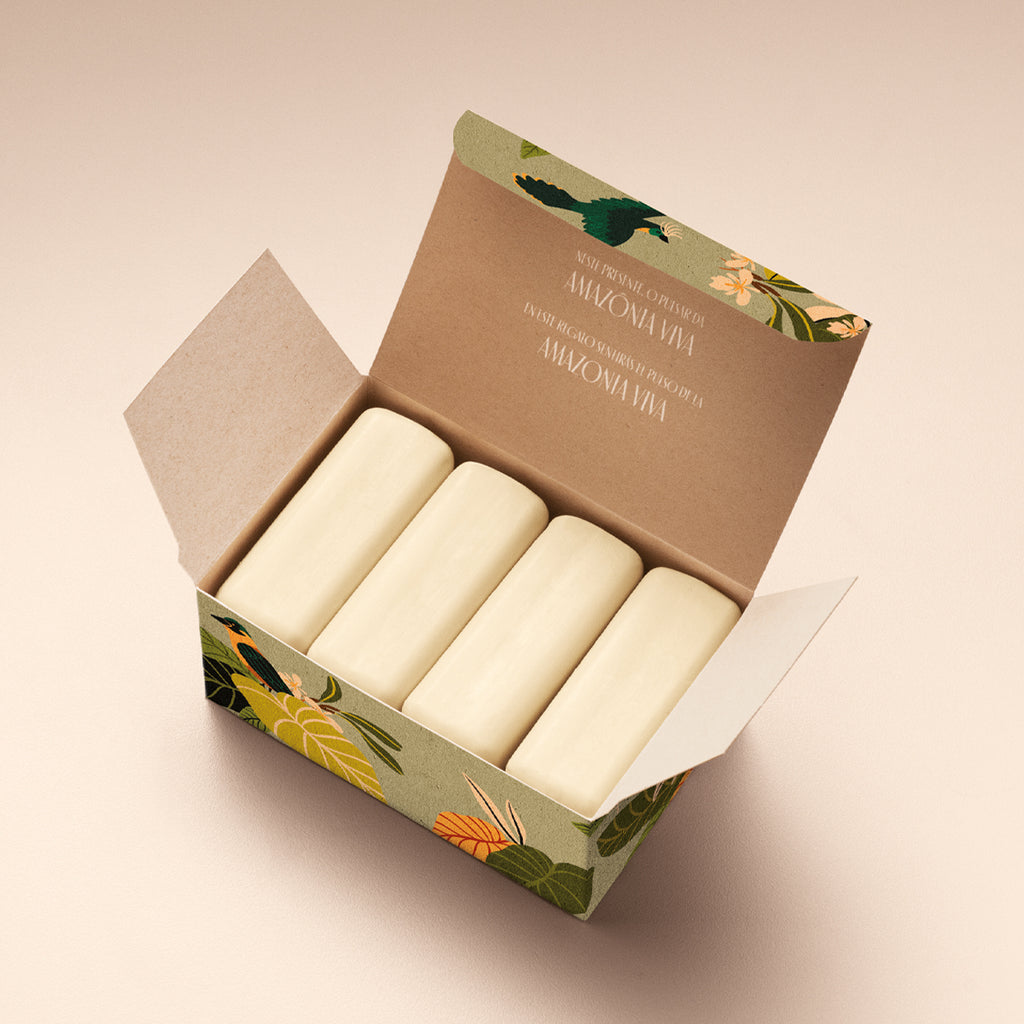 caixa com 4 sabonetes em barra de 100 gramas cada, sendo 2 de priprioca e 2 de breu branco.